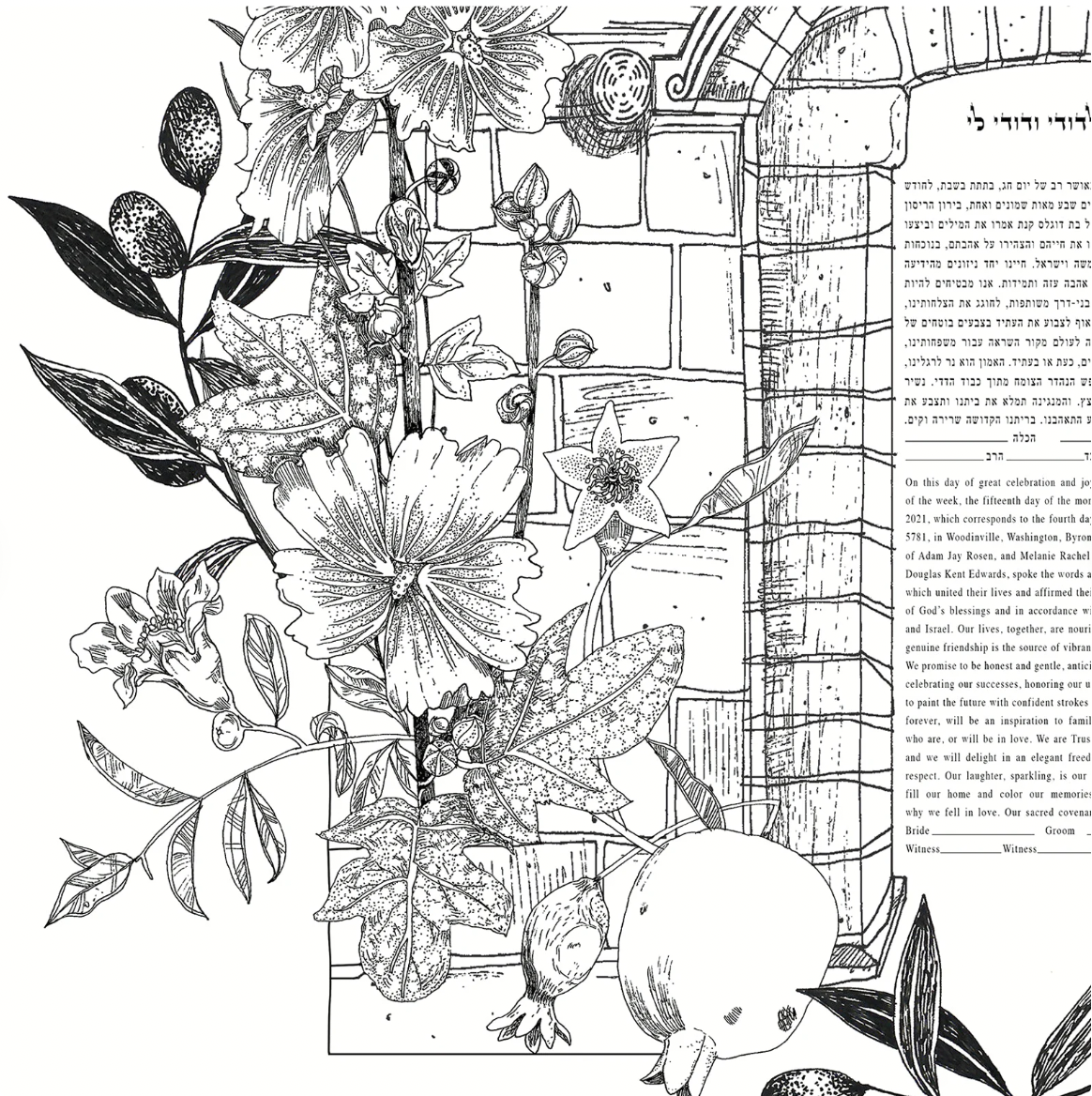 This Ketubah illustrates an old city of Jerusalem entryway, shaar yaffo, also known as Jaffa gate. A collection of plants local to Jerusalem create a border holding the gate.